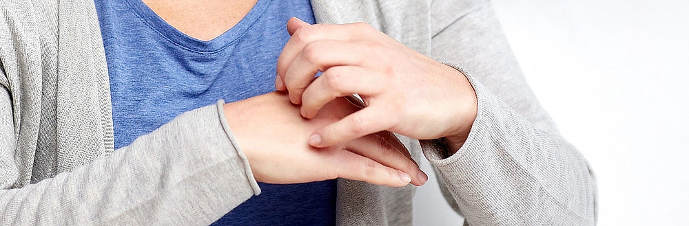 Obrázek 3: Svrab na pravé ruce a zápěstí. (Zdroj: Wikimedia Commons, Public Domain, https://commons.wikimedia.org/w/index.php?curid=1891004)