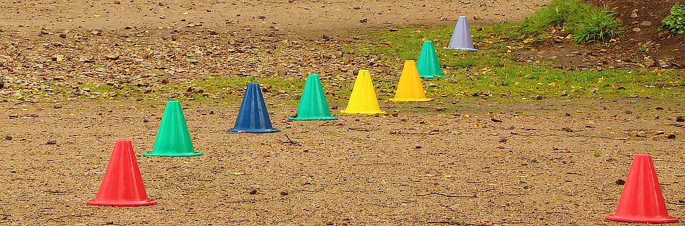 | 10 | Trefování kuželů. | Účastníci jsou rozděleni do dvou týmů a seřazeni v řadách za základní čárou. Mezi nimi jsou umístěny vyšší kužele. | Počet kuželů je minimálně stejný jako počet účastníků. Kužele lze nahradit plastovými lahvemi. | |