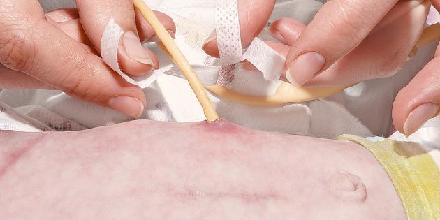 Při potřebě živit pacienta umělou výživou déle je vhodnější tzv. gastrostomie. Tenká hadička je vyvedena nosem, a pokud není využívána, je zašpuntována a stočena. Nemocný se může bez problémů mýt a čistit si zuby.